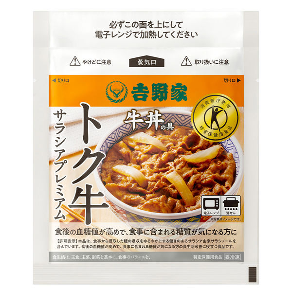 | 商品の特徴 | 吉野家の牛丼の美味しさそのままに。業界初!特保の牛丼。食後の血糖値が高めで食事に含まれる糖質が気になる方に。【許可表示】本品は食事から摂取した糖の吸収をゆるやかにする働きのあるサラシア由来サラシノールを含んでいます。食後の血糖値が高めで食事に含まれる糖質が気になる方の食生活改善に役立つ食品です。 | ||
