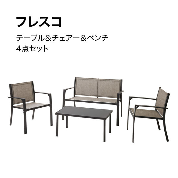 | 商品の特徴 | テラスでくつろぐテーブル&チェアー&ベンチの4点セット。どんな空間にもなじむシンプルなデザイン。大人4人がゆったりくつろげるサイズで家族で過ごしたり来客時にも活躍します。テーブル天板はブラックガラスで落ち着いたシックな印象です。飲み物などをこぼしてもサッと拭くだけでメンテナンスが簡単。チェアーはファブリック生地を使用しているので体がフィットしやすく、通気性の良い生地で快適な座り心地です。脚先は床を傷つけいにくいプラスチッククッション付き。 | ||