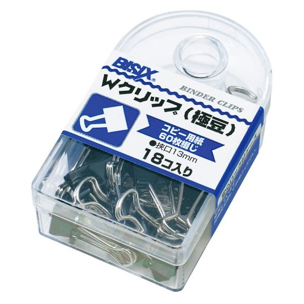 | 商品の特徴 | 定番のダブルクリップの極豆サイズです。挟み口サイズは、13mm。コピー用紙を約60枚挟めます。 | ||