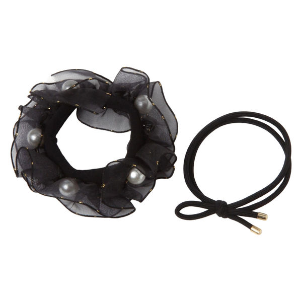 パールをあしらったシアーのシュシュと、リボンモチーフのヘアゴムの2点セット。