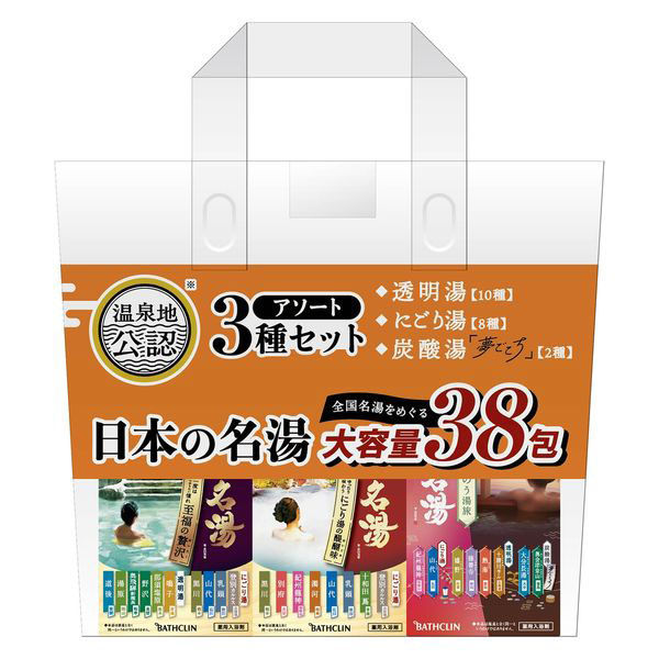 | 商品の特徴 | ●バスクリン 温泉タイプ入浴剤【日本の名湯】の大容量アソートセットです。●至福の贅沢(14包入)、にごり湯の醍醐味(14包入)、ととのう湯旅(10包入)が各1箱入った38包入りの大容量アソート●透明湯10種、にごり湯8種、炭酸湯(夢ごこち)2種が楽しめます。●本品は温泉と全く同一というわけではありません | ||