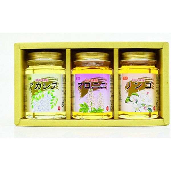 | 商品の特徴 | 秋田・青森県を中心に生産したアカシアの花はちみつは、淡い色とあっさりした甘さが特徴のはちみつと、マロニエはちみつは、高い香りとコクのある甘さが特徴のはちみつです。青森県津軽地方で生産したリンゴの花はちみつは、ほのかなリンゴの香りとコクのある風味が特徴のはちみつです。(調味料ギフト) | ||