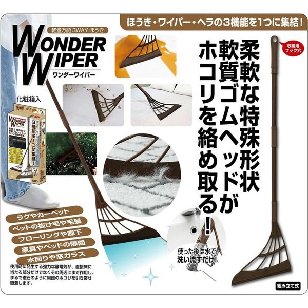 | 商品特徴 | 柔軟な特殊形状軟質ゴムヘッドがホコリを絡め取ります。 フローリングなどの床の掃き掃除の際には床の摩擦力を利用しホコリをお互いに絡ませクルクル丸めて絡め取ります。 また、使用時に発生する強力な静電気が、直接床に当たる部分だけでなく、周辺にも作用して周囲の細かいホコリを掻き出します。 ラグやカーペットも、ペットや毛髪などを絡め取るようにお掃除できます。 水回りや窓の結露はワイパーとしてご使用ができ、色々な場面で活躍します。 汚れた場合は、直接水で洗い流せるのでお手入れも簡単。 ネジジョイント式で、中間パイプを接続する事で長さを2段階に調節できる他、使わない時はバラバラしてコンパクトに収納する事もできます。 | ||