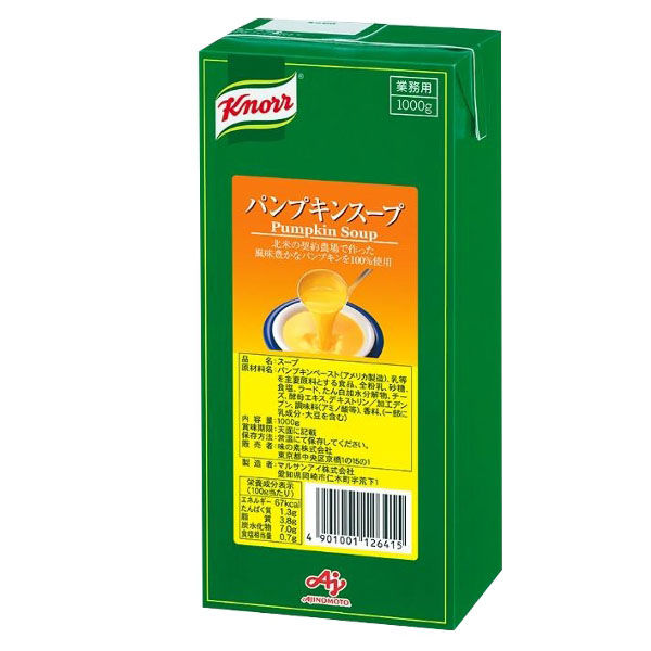 | 商品の特徴 | クノールRの指定農場で作った、味・風味豊かなパンプキンを100%使用したパンプキンスープです。アセプティック(無菌充填方式)なので、素材の風味が活きています。 | ||