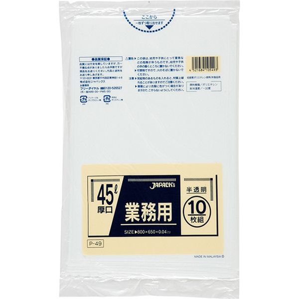 ジャパックス 業務用ポリ袋 45L10枚 半透明 厚み0.04mm P-49 10冊(100枚)