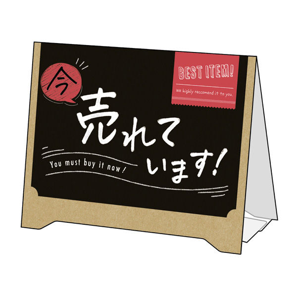 | 商品の特徴 | ミニイーゼルのようなデザイン!置くだけ簡単!組立式 サインPOP 今、売れています!・ワンタッチ組み立てで簡単。不要になったら畳んで片付けられます。黒板に文字を書いている風のデザインでどんな商品にも馴染みます。 | ||
