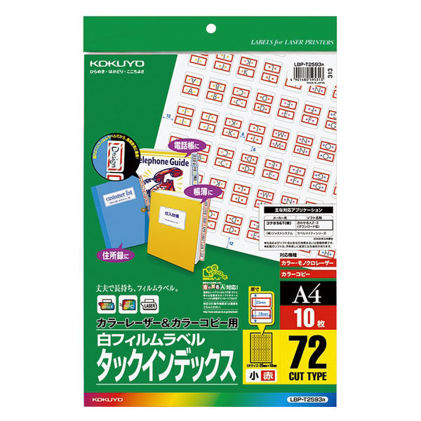 | 面数/(1シートあたり) | 72 | 商品説明 | ●ファイル・マニュアル・電話帳などのインデックスをカラーレーザー・カラーコピー機で簡単に美しく出力できます。●1シートあたりのカット数が多いので、オフィスで大量に使用する際に便利です。●簡単ラベル印字ソフト〈合わせ名人〉を使えば位置合わせが簡単に行えます。●〈合わせ名人〉はコクヨのホームページよりウェブ版もしくはダウンロード版で利用できる無料の印字ソフトです。 |