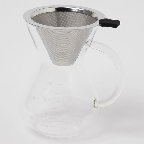 注意事項 ドリップポットはガラス製のため、割れやすいので落下・衝撃にはご注意ください。ステンレスメッシュフィルタの内側はフチが鋭利な形状になっております。洗い物のさいには十分ご注意の上お取り扱いください。 使用方法 ステンレスメッシュフィルタをドリップポットにセットし、フィルタにコーヒー粉をお好みの量入れお湯を注いでください。