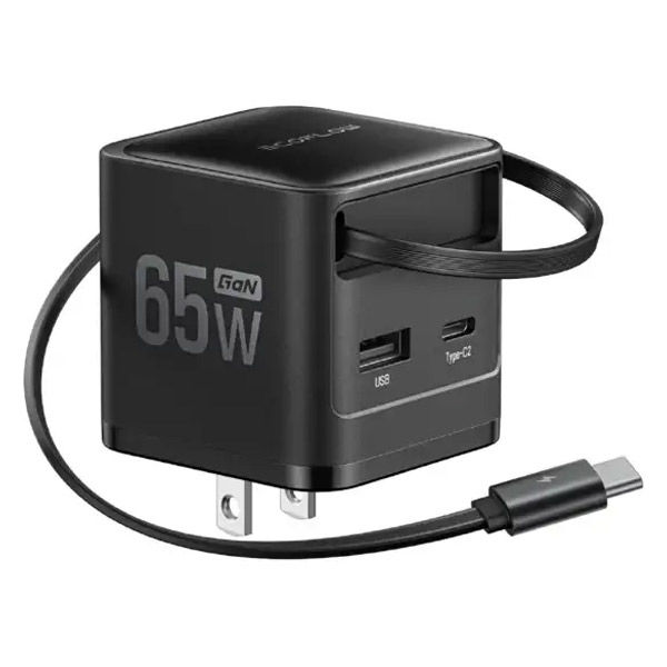 | 商品の特徴 | 1ポート最大65W、複数ポートで合計65Wの超急速充電ができるAC充電器。スマホやタブレット、携帯型ゲーム機やノートPC まで幅広い機器に対応●65W USBーCポート、USBーAポート、内蔵USBーCケーブル(70cm)により、最大3台の同時充電が可能●複数の機器を同時に充電できるため、デスクやPC周りの充電ケーブルもこれ1台でスッキリ。内蔵ケーブルは巻き取り式で本体にしっかり収納できて絡まらず、ACプラグも折りたたみ式。余計なスペースを取らず、持ち運びにも便利です。 | ||