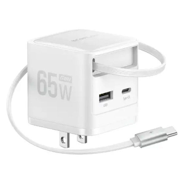 | 商品の特徴 | 1ポート最大65W、複数ポートで合計65Wの超急速充電ができるAC充電器。スマホやタブレット、携帯型ゲーム機やノートPC まで幅広い機器に対応●65W USBーCポート、USBーAポート、内蔵USBーCケーブル(70cm)により、最大3台の同時充電が可能●複数の機器を同時に充電できるため、デスクやPC周りの充電ケーブルもこれ1台でスッキリ。内蔵ケーブルは巻き取り式で本体にしっかり収納できて絡まらず、ACプラグも折りたたみ式。余計なスペースを取らず、持ち運びにも便利です。 | ||