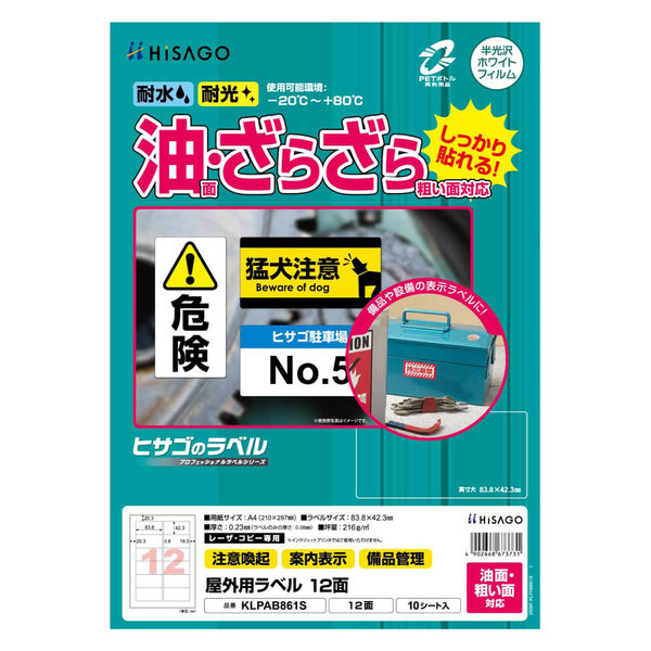 ヒサゴ 屋外用ラベル 油面・粗い面対応A4 12面 KLPAB861S 1袋(10シート入)