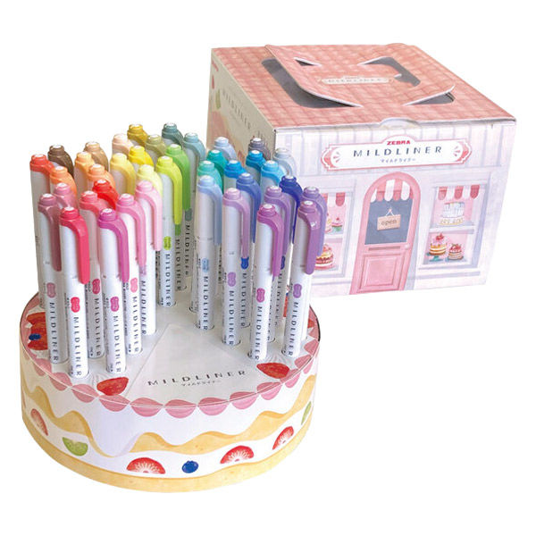| 商品の特徴 | ふんわりやさしい色の蛍光ペン。目がチカチカしない淡いカラーなので、参考書や教科書・ノートへの記入や、書類の多いビジネスシーンに最適です。落ち着いた色味はマーキングに限らず、イラスト書きやぬりえでも活躍します。カラーバリエーション豊富で使い分け可能。かわいいカラーで勉強や仕事をもっと楽しく。太・細字のツインタイプ。数量限定の全色セット。プレゼントにもぴったり!すっきり収まるから使いたい色がすぐ見つかる、ケーキに見たてたかわいいペン立て付き。 | ||