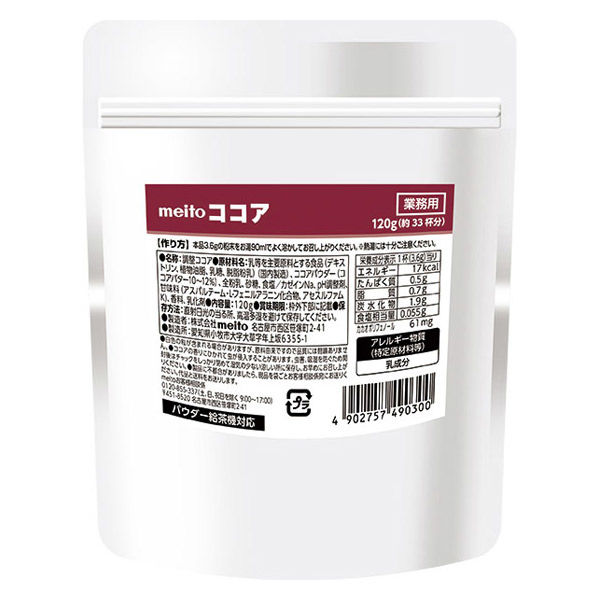 | 原材料 ※お手元に届いた商品を必ずご確認ください | 乳等を主要原料とする食品(デキストリン、植物油脂、乳糖、脱脂粉乳)(国内製造)、ココアパウダー(ココアバター10~12%)、全粉乳、砂糖、食塩/カゼインNa、pH調整剤、甘味料(アスパルテーム・L-フェニルアラニン化合物、アセスルファムK)、香料、乳化剤 | 内容量 | 120g |