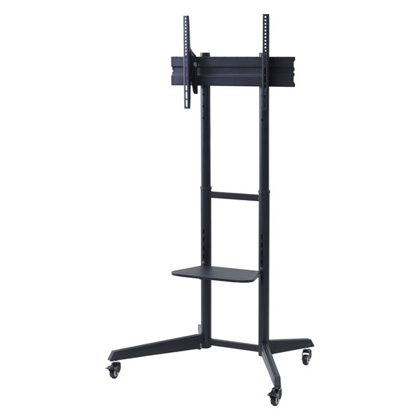 37~70インチ対応、キャスター付きのディスプレイスタンド。耐荷重50kg。4段階に高さ調節ができる。上下角度調節も可能(チルト機能)。好みの高さに可動棚を設置できる。