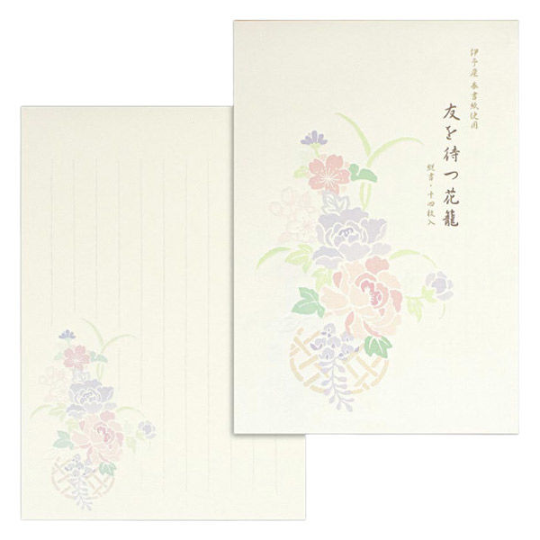 | 商品の特徴 | 奥行き感のあるデボス加工の花籠のイラストが入った和紙便箋です。 | ||
