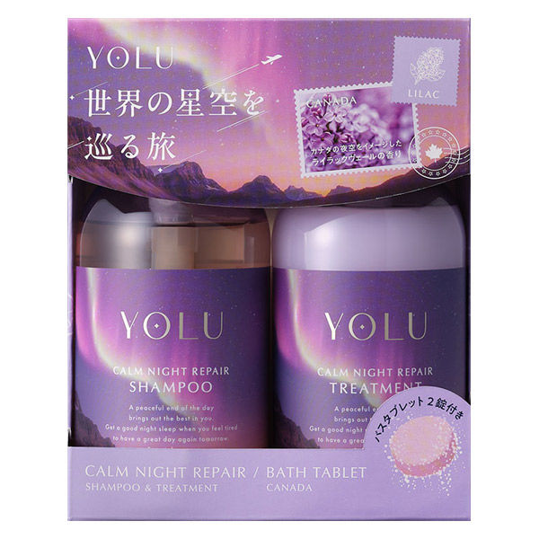| 商品の特徴 | YOLU 世界の星空を巡る旅カナダの夜空をイメージしたライラックヴェールの香りが限定発売シャンプー・トリートメントに、バスタブレット2錠がセットになったお得な数量限定ヘアケアセット【シャンプー・トリートメント】髪の内側から毛先まで濃密集中補修【バスタブレット】美容液成分が溶け込んだ、まろやかなお湯に包まれて夢のような心地よいバスタイムをシャンプー トリートメント セット シャンプー メンズ レディース シャンプー トリートメント コンディショナーセット シャンプー YOLU ヨル よる 入浴剤 | ||