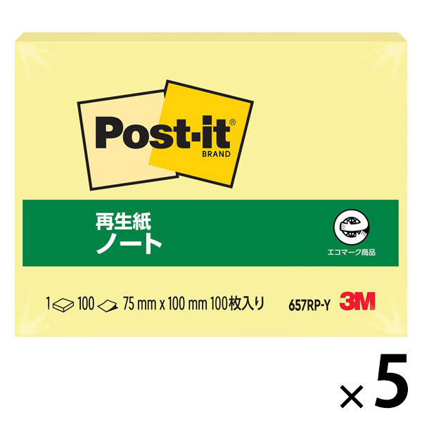 スリーエム(3M) ポストイット ふせん 付箋 再生紙 ノート 75mm×100mm イエロー 1セット(1冊×5) 657RP-Y