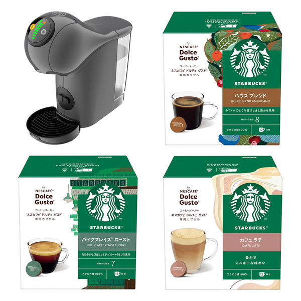 | 商品の特徴 | 横幅がスリムなボディでIoTモデルのジェニオ エス ベーシックにスターバックスカプセル3種(ハウスブレンド・パイクプレイス ロースト・カフェラテ)、什器がセットになった商品です! 手軽にオフィスや自宅がカフェスタイルに。1杯ずつ淹れたてコーヒーのおもてなし。<ハウスブレンド>ナッツとカカオのニュアンスに、ローストによるかすかな甘みを加えて、一層豊かな風味に。<パイクプレイス ロースト>毎日飲むのにぴったりなまろやかな味わい。<カフェラテ>カフェで人気のラテ。毎日飲むのにぴったりの味わい。 | ||