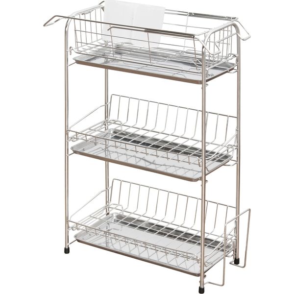 水に強いステンレス製です。上段バスケットは外せばシンク用にも使用できます。まな板が立てられるスタンド付きです。