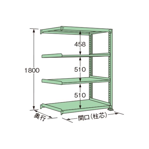 商品の特徴 ●グリーン色の連結タイプ。●荷重500kg、天板を含むラックの棚段数は4段です。●ボルトレスで、組み立ては実に簡単●豊富なオプションパーツを採用することで、様々な荷姿に対応できます。●全ての取付け部分にはボルトレス方式を採用。棚板の着脱はもとより、分解・組み立てが短時間で簡単に行えます。●保管物の形状や数量に合わせて、各棚板を50mmピッチで自由に調整できます。【注意・使用条件】●積載質量制限あり【画像注意事項】●寸法図は『MM1809M04R』の画像を使用しています。