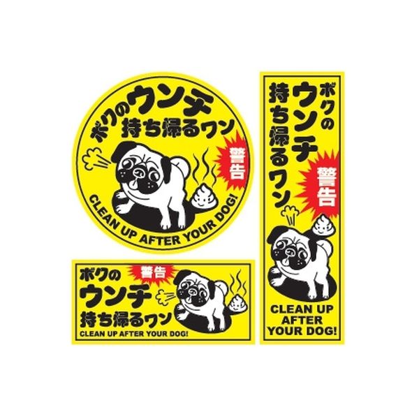 - 【仕様】 ●カラー:イエロー ●3枚セット ●表示:ボクのウンチ持ち帰るワン ●材質:塩ビシート ●表面加工:UVカット加工(UVカット塗料印刷) ●サイズ(mm): ・直径130(1枚) ・W60×H194(1枚) ・W130×H60(1枚) ●使用場所:屋内・屋外 【用途】 ●マナーやモラルなどの警告に ●住居や施設などの防犯対策に ●地域の防犯と治安向上のために 【ご注意】 ※本製品は、盗難防止用品ではありません。万一、犯罪・事故が発生した場合の損害について、一切責任を負いません。 ※本製品を貼り付ける表面にザラつきがある場所やコンクリート等のステッカーのはがれやすい場所には使用できません。 ※日光や雨が直接当たる場所などは、色あせやはがれたりする場合がありますのでご使用はお避けください。