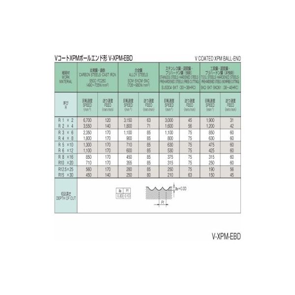 | 商品の特徴 | ●【商品説明】●Vコーティングを施した粉末ハイスXPMボールエンドミルです。●コバルトを含有する材料を使用しています。●耐溶着性、耐摩耗性に優れています。●G-LIST No.:EH1109●材質:高級粉末ハイス●表面処理:Vコーティング(複合多層コーティング)●ねじれ角(°):32●ボール半径RE(mm):R2●外径DC(mm):4●全長LF(mm):80●刃長APMX(mm):8●シャンク径DCON(mm):6●重量(g):22●刃数(枚):2●コバルトの含有:○ | ||