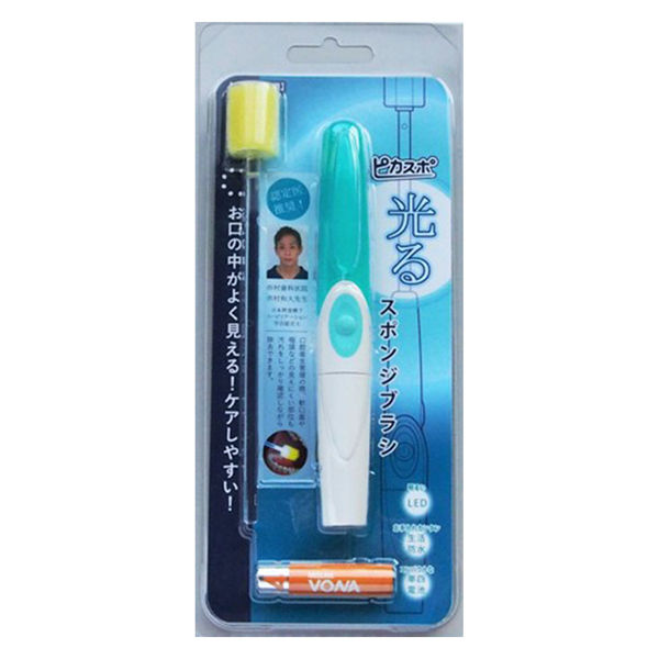 | 使用電池 | 単4アルカリ電池×1本(テスト用付属) | 使用方法 | スポンジ部分に水またはマウスウォッシュ等をつけ絞ってから口腔内に挿入し、口腔内のケアを行う。本体のスイッチ(緑色の円形部分)を押すと本体内部の LED ライトが点灯する。 |