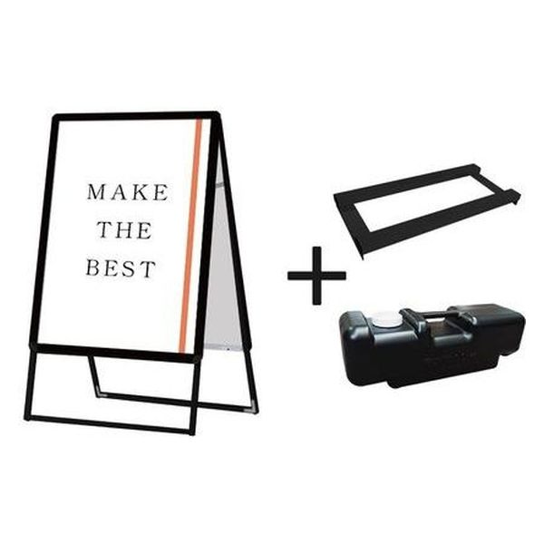 【ポスタースタンド】四辺を開閉してポスターを交換する最もメジャーなスタンド看板。転倒防止に役立つアーム+重しセット。