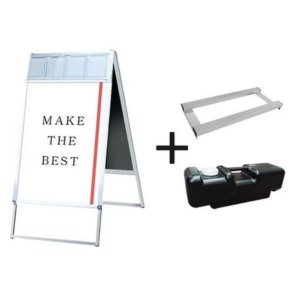 【ポスタースタンド】A4三つ折りパンフレットを配布できるケースが付いた四辺開閉式のスタンド看板。転倒防止に役立つアーム+重しセット。