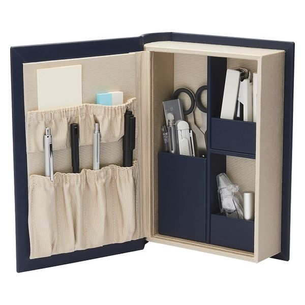 | 商品の特徴 | 知的なネイビーのブック型収納ケース。仕切りやポケットが多いので色んな文具に対応し、程よい重みのおかげで取り出しやすく使い勝手抜群。閉じれば既にインテリア小物。テレワークされる方には特に喜ばれる”今”欲しいアイテム。 | ||