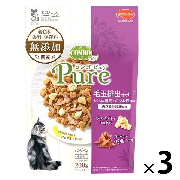 コンボ ピュア キャット 毛玉排出サポート まぐろ味・鶏肉・かつお節添え 無添加 国産 200g(小分け2袋)3個 キャットフード