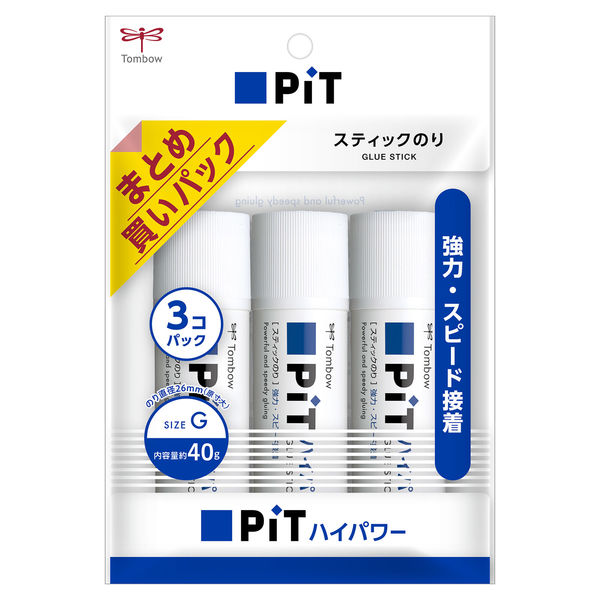 | 商品の特徴 | ピッと塗って、ピッと貼れる、国産初のスティックのり「ピット」のスタンダードタイプ。強力ハイパワーで、封筒、画用紙、厚紙も強く接着できます。スピーディーでしっかりとした仕事ぶりのスティックのりです。パック入りG(大)サイズ。3本入り。容量40g。のり径26mm。バラ品番:PT-GP【使用方法】・のりは3~4mm繰り出してご使用ください。出し過ぎると戻らなくなることがあります。 | ||