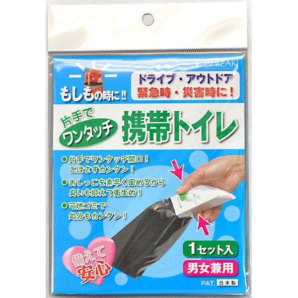 | 商品の特徴 | 片手でこぼさず簡単にご使用いただけます *凝固スピードが速く、こぼれ・臭いを完全に防ぎます。 *使用後は、通常の燃えるゴミとして廃棄出来ます。 *コンパクトで緊急対応力に優れています。 *弁と吸水ポリマーが臭いの放散と尿の逆流を防ぎます。 | ||