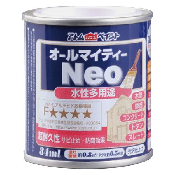 | 商品の特徴 | カラーやサイズのバリエーションも豊富で学園祭や体育祭、文化祭をはじめ本格的な建築用途まで幅広い用途、幅広いお客様から支持されている塗料です。別売りの「アトムつや調整剤」を使用することで、オールマイティーネオのつやを調整することができます。用途:(コンクリート)モルタル、ブロック、外かべ等/(スレート)スレート屋根、スレート瓦/(トタン(屋根除く))トタン板、下見トタン | ||