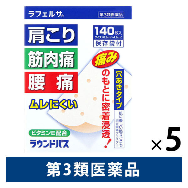 ラフェルサ ラウンドパス 140枚 5箱セット 大協薬品工業 貼り薬 プラスター剤 穴あきタイプ ムレにくい 肩こり 筋肉痛 腰痛【第3類医薬品】