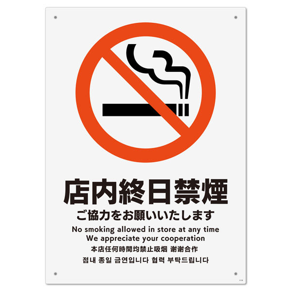 | 商品の特徴 | 終日禁煙・喫煙禁止・タバコ禁止のお店で協力をお願いする禁煙標識サイン看板。 | ||