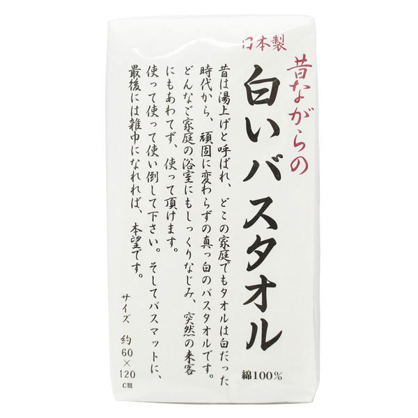 | 商品の特徴 | 昔は湯上げと呼ばれ、どこの家庭でもタオルは白だった時代から、頑固に変わらずの真っ白のバスタオルです。どんなご家庭の浴室にもしっかりなじみ、突然の来客にもあわてず、使って頂けます。使って使って使い倒して下さい。そしてバスマットに、最後には雑巾になれれば、本望です。 | ||