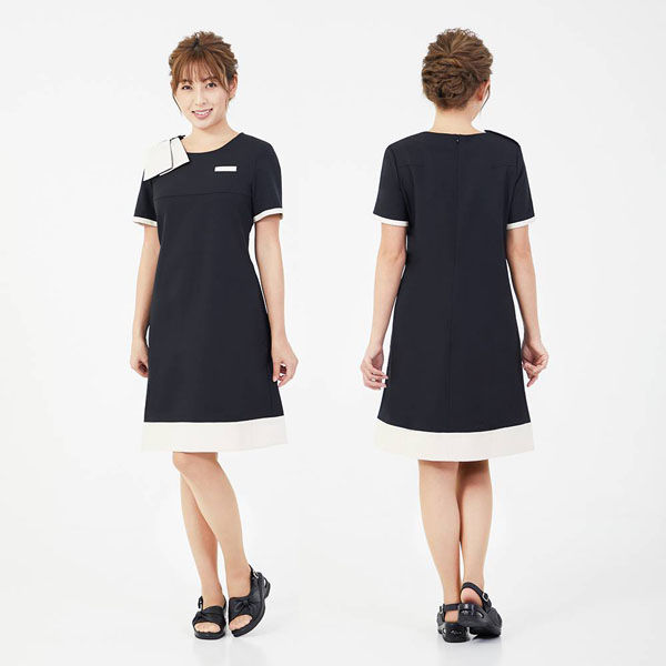 上品なAラインのシルエットと肩のリボンが可愛らしさを演出、前後に変動可能な肩リボンが顔まわりを華やかに、優雅な印象でコンシェルジュやフロントワークにもおすすめなデザイン