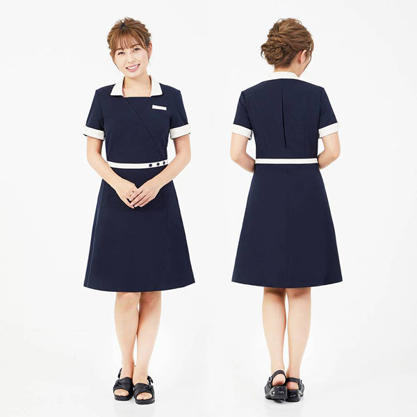| 商品の特徴 | 襟とウエストの切り替えがポイントのデザイン性の高いワンピース。 襟をサイドにデコルテラインをすっきり美しいシルエットに演出。 ウエストラインの切り替しは細ベルトをつけているような印象で細部にわたり女性らしい優しさを引き立てる。 100%ポリエステル、縦横ストレッチ、制電性繊維使用 胸元ボタン・胸ポケット・背中ボックスプリーツ・両サイドポケット | ||