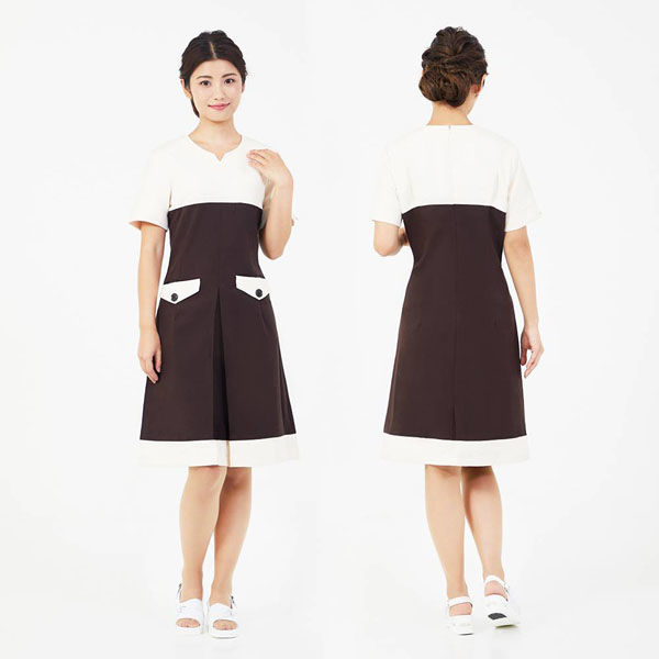 | 商品の特徴 | バイカラーとバスト部分のライン切り替えでウエストラインを高く、シャープですっきりとスタイルアップを演出、撥水・撥油加工に優れオイル染みしにくい生地は汚れにくく、長く着用いただけます、前ボックスプリーツで足さばきがよく動きやすい機能性もプラス。 100%ポリエステル、縦横ストレッチ、制電性繊維使用 バックファスナー・胸ポケット・前ボックスプリーツ・バックスリット・撥水、撥油加工 | ||
