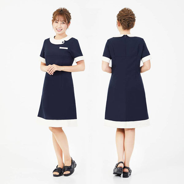 | 商品の特徴 | シンプルでベーシックなデザインに可愛らしさをプラスしたワンピース、深みのあるネイビーが上品でありながら、襟を丸く飾りボタンをポイントにした可愛らしさも兼ね備えたデザイン。撥水・撥油加工に優れオイル染みしにくい生地は、オイルトリートメントやリフレクソロジーにも汚れにくく長く着用いただけます。 100%ポリエステル、縦横ストレッチ、制電性繊維使用 バックファスナー・胸ポケット・前ボックスプリーツ・バックスリット・撥水、撥油加工 | ||
