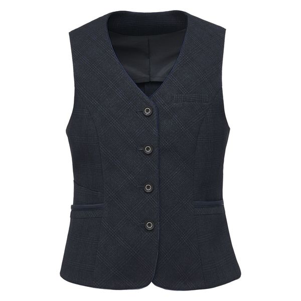 商品の特徴 ベーシックな4つボタンベスト。上品なグレンチェック柄。前中心見頃の地の目をバイアス使いにし、スタイルよく見せます。前端から裾にサテンのパイピング、後ろウエストにサテンベルトを配して腰高に見せます。裾は少し長めにしてヒップを小さく見せます。白×黒、グレー系、ネイビー系の3色展開。 右衿ぐり見返しにはアクセサリー用のホルダー付き、左胸ポケットにネームホルダーが付いています。ポケット内布に抗ウイルス素材「クレンゼ」を使用、スマホの入るチェンジポケット付きです。裏地は背抜き仕立てで、家庭洗濯が可能です。
