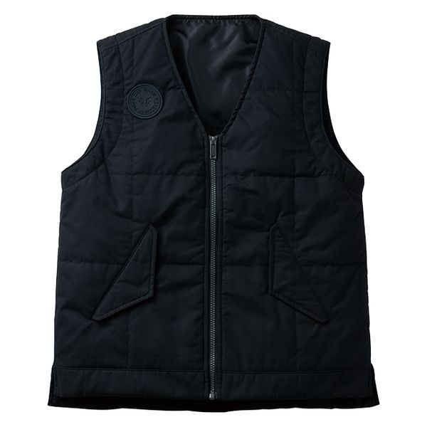 | 材質 | (素材)表地:ポリエステル65%・綿35%(T/Cタフタ ピーチ起毛加工) 裏地:ポリエステル100%(タフタ)中綿:ポリエステル100% | その他特徴 | 両脇フラップポケット(隠しドット釦)・Vネック・右胸ラバーワッペン・右脇ポケット発熱体用ケーブルホール付き |