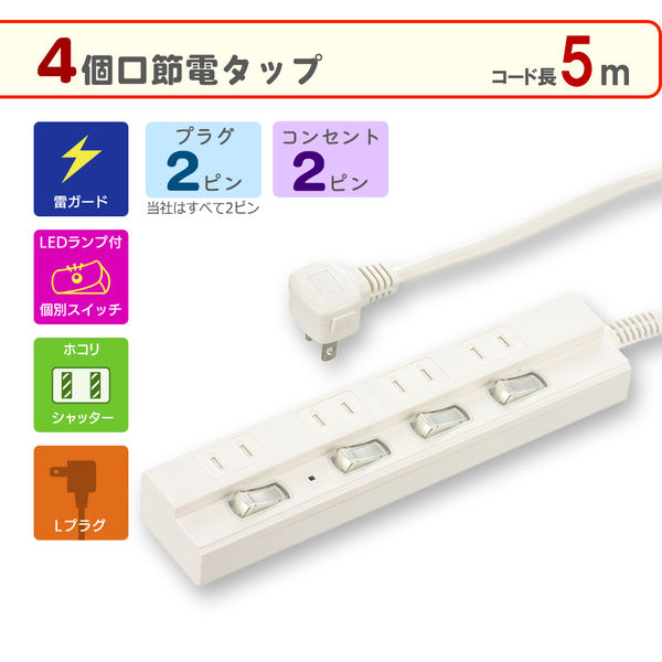 延長コード 電源タップ AC×4個口 5m ホワイト Y02S405WH YAZAWA 1個