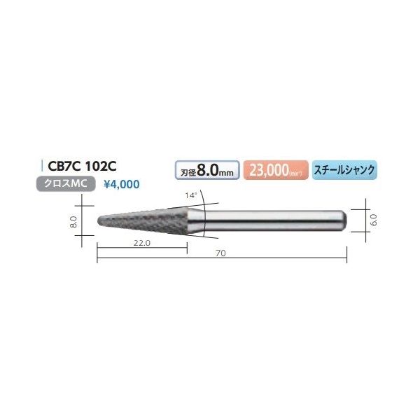 - ●【商品説明】●クロスカットに比べ刃数が少なく切削量が多くなります。●クロスカットに比べ仕上げ面は劣ります。●クロスカットに比べ目詰まりしにくくなります。【その他注意事項】●超硬バーにキズ、外見上の異常等の無いことを確認の上使用下さい。●取付けは正しく行い、シャンクの突き出し長さ(オーバーハング)を最小にし、確実にチャッキングして下さい。●空回転し振れや異常の無いことを確認する。●作業中に無理にこじったり、過剰な力を押し付けないで下さい。●作業中は必ず保護メガネや防塵マスクを着用して下さい。●シリーズ:CBシリーズ●ヘッド形状:タイプ7●カット:クロスMC●シャンク径(mm):6.0●刃径(mm):8.0●刃長(mm):22.0●全長(mm):70●推奨回転数(min-1):23000●シャンク材質:スチールシャンク