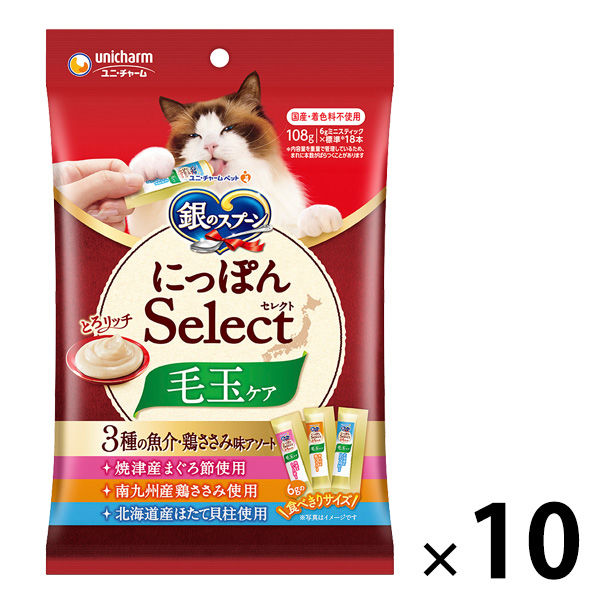 本商品:銀のスプーン にっぽんセレクト 3種の魚介・鶏ささみアソート 毛玉ケア(6g×18本)10袋 猫用 おやつ