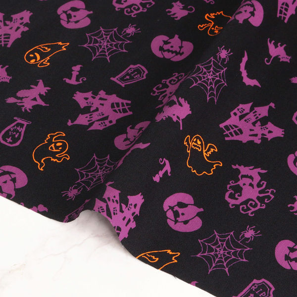 日本紐釦貿易 国産ハロウィン柄プリント生地 シルエット柄 カット販売巾110cm×8m ブラック地/パープル H7099-1C(直送品)