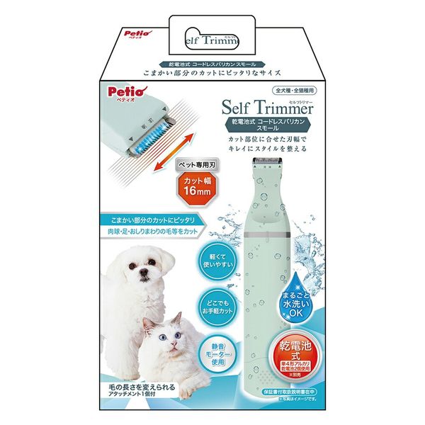 | 商品の特徴 | ●こまかい部分のカットにピッタリなサイズで、肉球・脚・おしり・顔・口まわり等をカットできるコードレスバリカンです。●被毛のカットに最適なステンレス固定刃・セラミック可動刃の2種類の組合せです。●すぐに使える乾電池式。アタッチメントも付いていて、キレイにスタイルを整えます。●まるごと水洗いOK。使った後も清潔さが保てます。 | ||
