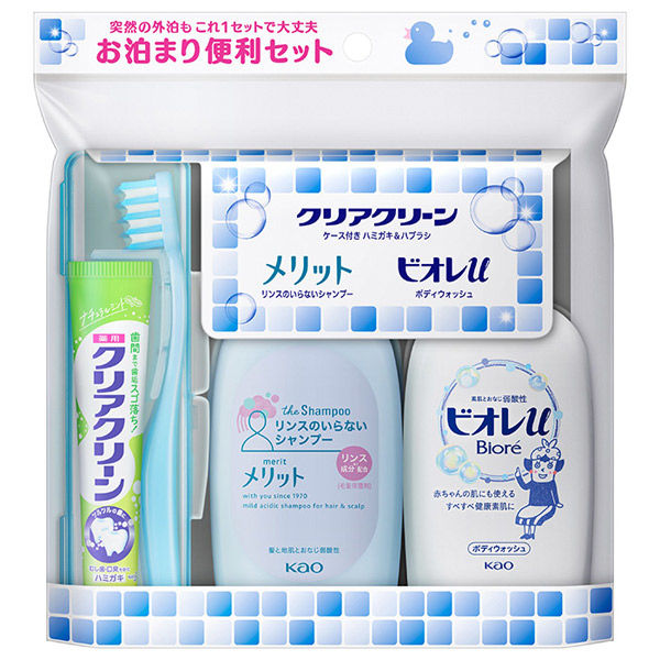 | 内容量 | ビオレU90ml、メリットリンスのいらないシャンプー80ml、クリアクリーン歯磨き17g、クリアクリーン歯ブラシ1本 | ||