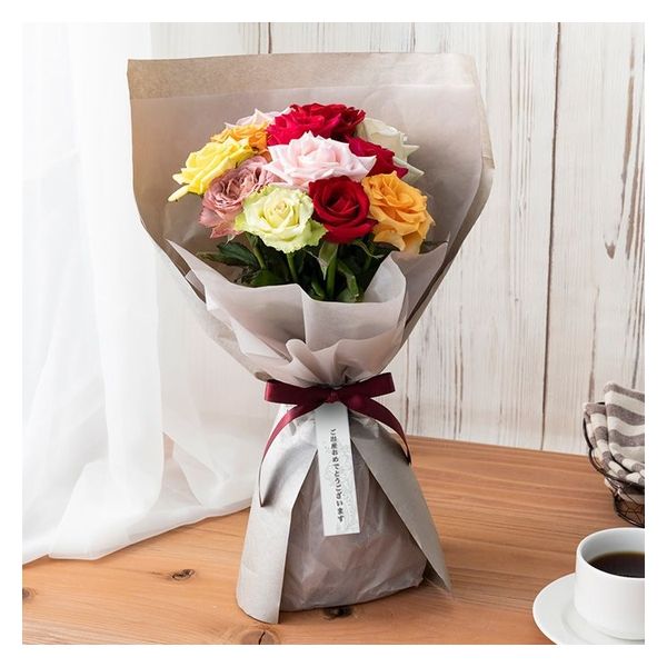 - おまかせバラ(ミックスカラー)×12本、カード熨斗、スタンディングブーケのしおり付き